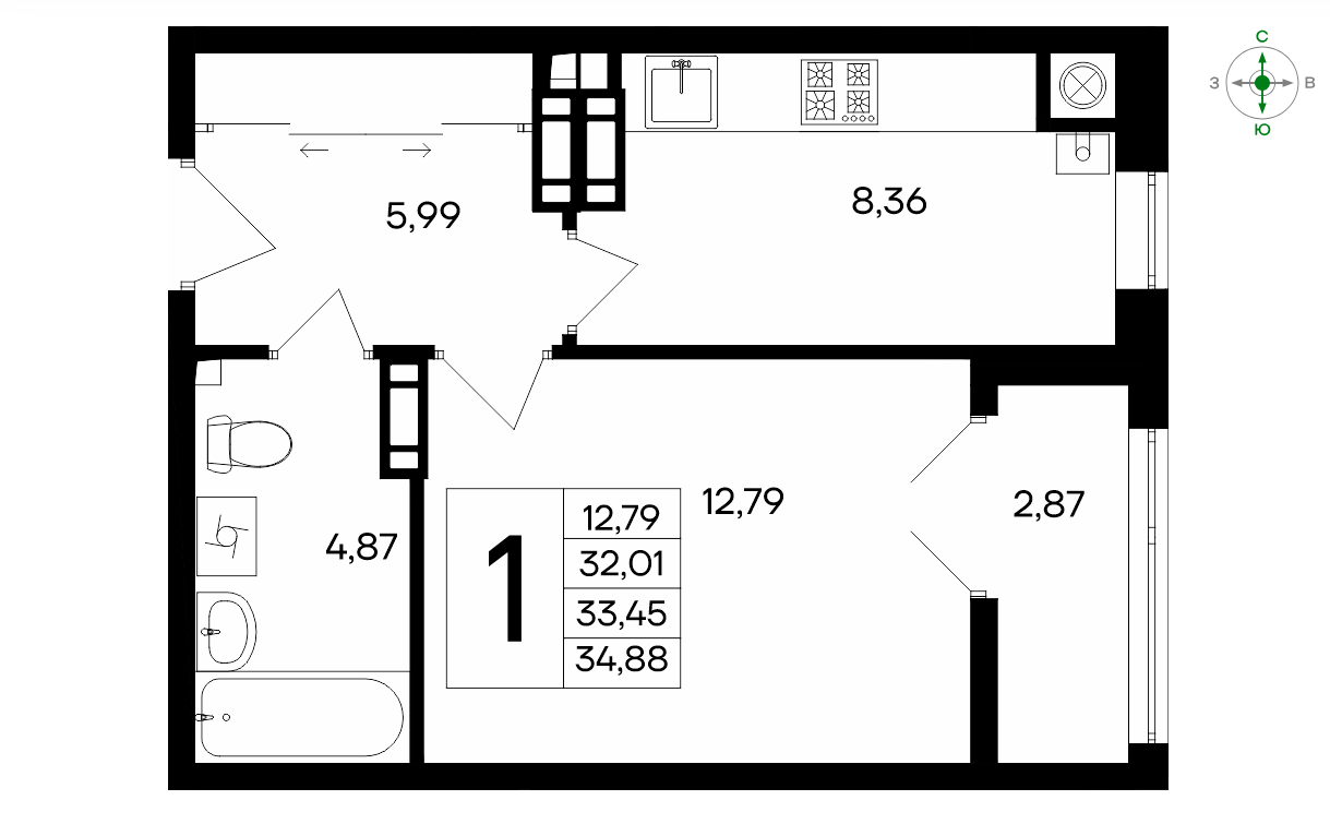 Количество комнат1-к квартира Этаж6 Площадь общая34.88 Площадь жилая12.79 Площадь кухни8.36 Площадь комнат12.79 Лоджий1 Совмещенных санузлов1 ОкнаДвор + улица ОтделкаПредчистовая