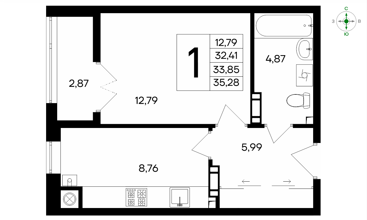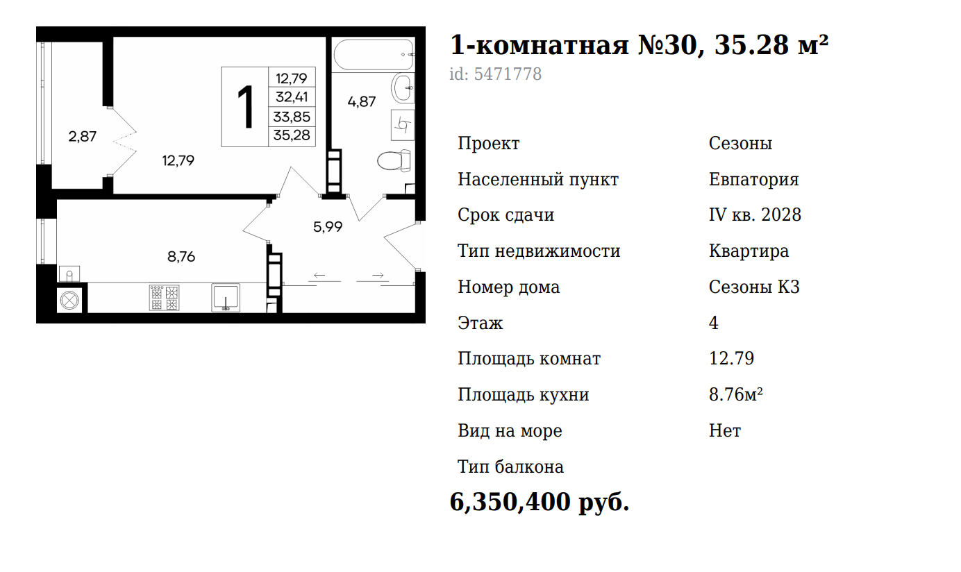Количество комнат1-к квартира Этаж4 Площадь общая35.28 Площадь жилая12.79 Площадь кухни8.76 Площадь комнат12.79 Лоджий1 Совмещенных санузлов1 ОкнаДвор + улица ОтделкаПредчистовая