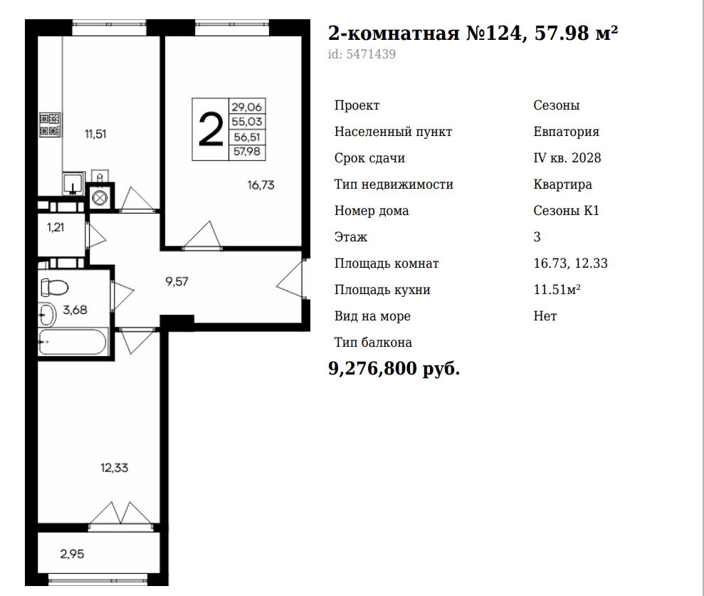 Количество комнат2-к квартира Этаж3 Площадь общая57.98 Площадь жилая29.06 Площадь кухни11.51 Площадь комнат12.33+16.73 Лоджий1 Совмещенных санузлов1 ОкнаДвор + улица ОтделкаЧерновая
