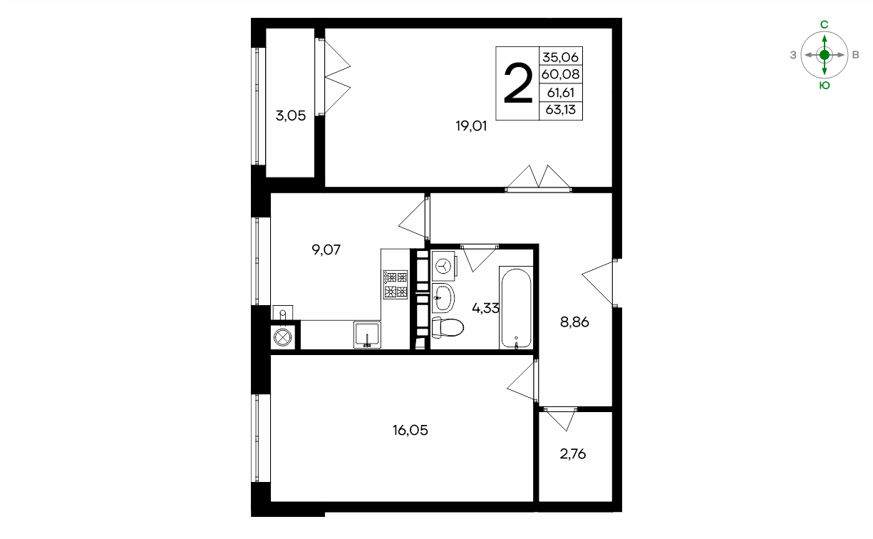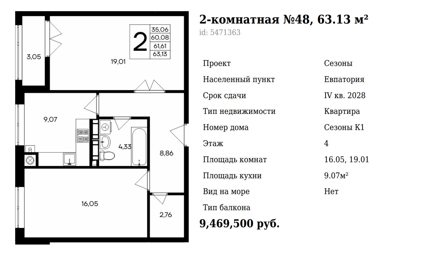 Количество комнат2-к квартира Этаж4 Площадь общая63.13 Площадь жилая35.06 Площадь кухни9.07 Площадь комнат16.05+19.01 Лоджий1 Совмещенных санузлов1 ОкнаДвор + улица ОтделкаЧерновая