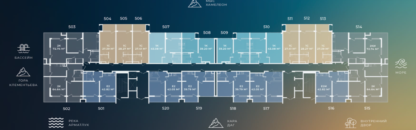 Каждое планировочное решение располагает собственной террасой с великолепным видом на море и горы, обеспечивая идеальные условия для наслаждения утренним кофе или вечерними закатами.