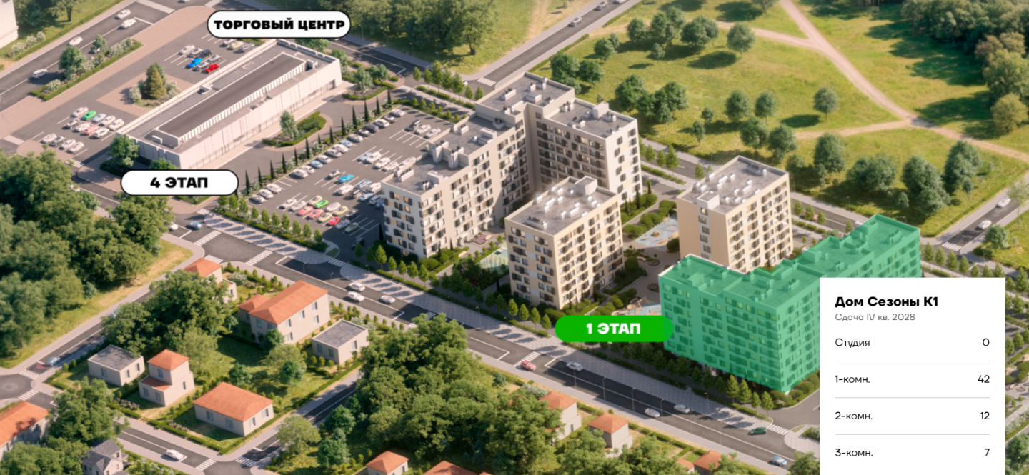 «Сезоны» – это 12 домов переменной этажности, где всё продумано до мелочей. На территории будет построен современный двухэтажный торговый центр, всё необходимое – в шаговой доступности. Первый этап строительства включает четыре дома с секциями на 7, 8 и 9 этажей.
