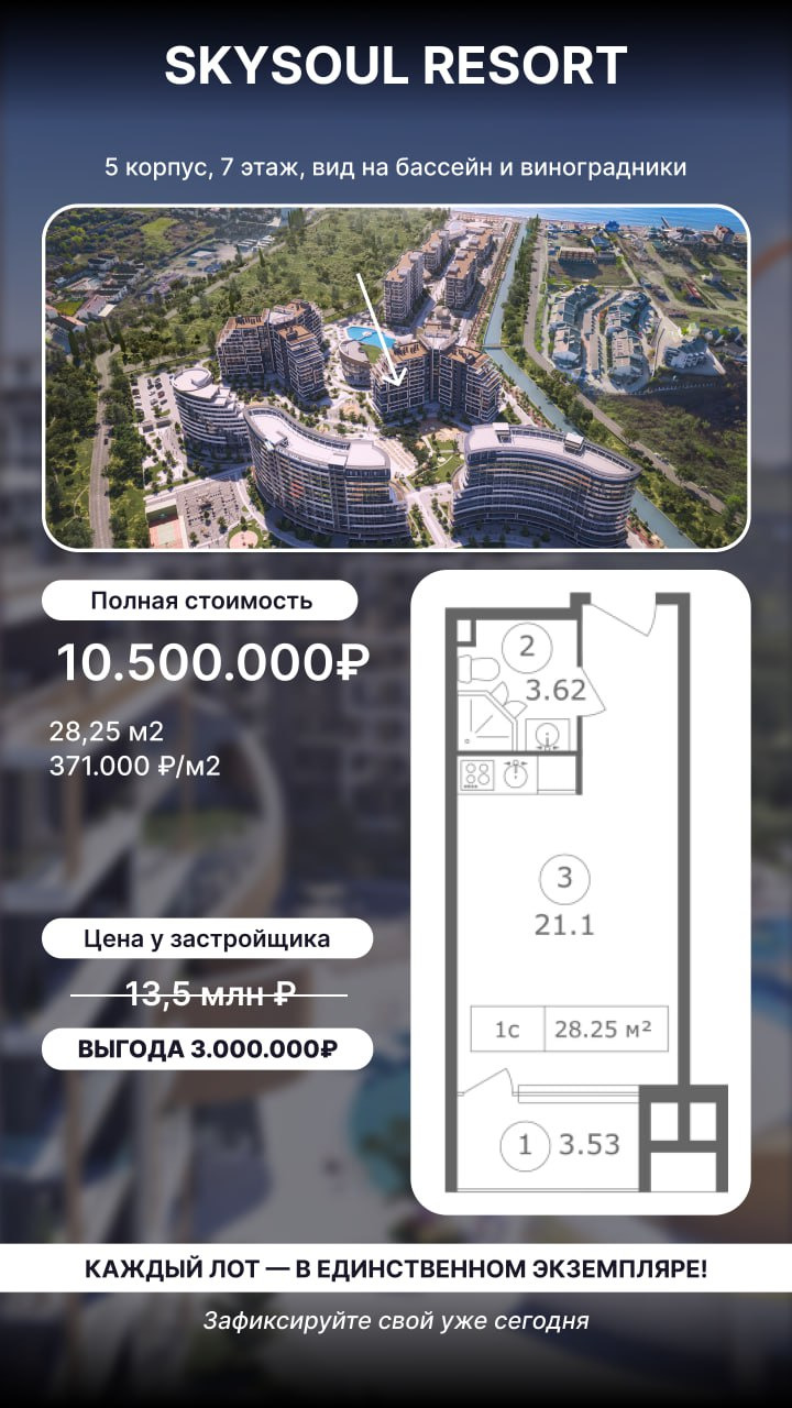 Название ЖКТуристическо-рекреационного комплекс «SkySoul Resort»Год сдачи2026-2027КварталIIТип домаМонолитныйЭтажей в доме12Грузовых лифтов1Пассажирских лифтов1Серия дома5Высота потолков2.85ПарковкаМногоуровневая