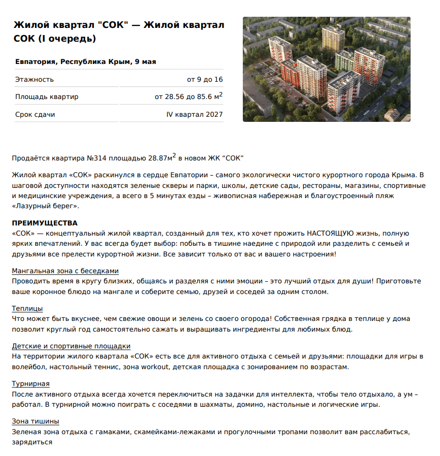 ЖК «СОК» – семейный жилой комплекс в экологически чистом центре древнего города Евпатория, респ. Крым, на уникальном бальнеологическом и морском курорте.