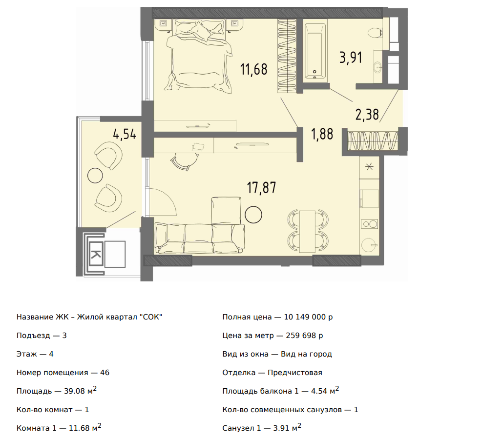 Количество комнат1-к квартираЭтаж4Площадь общая39.08Площадь жилая11.68Площадь кухни17Площадь комнат11.68Балконов1Совмещенных санузлов1ОкнаУлицаОтделкаПредчистовая
