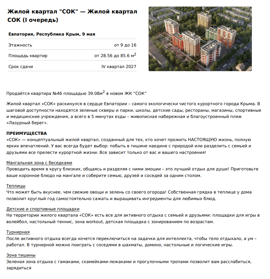 ЖК «СОК» – семейный жилой комплекс в экологически чистом центре древнего города Евпатория, респ. Крым, на уникальном бальнеологическом и морском курорте.